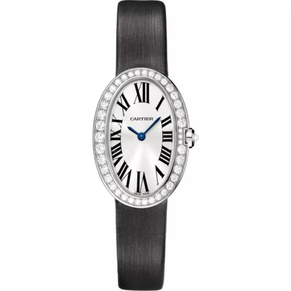 The Cartier Baignoire Small Model WB520008 exudes timeless elegance with its distinctive oval 18k white gold case, encircled by a diamond-set bezel. A silver sunray dial with Roman numerals and blued-steel hands reflects Cartier’s refined heritage. Paired with a satin strap and powered by a quartz movement, this graceful timepiece embodies poetic sophistication—an exclusive symbol of feminine luxury and the maison’s enduring legacy of understated glamour.