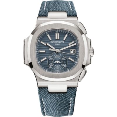 The Patek Philippe Nautilus 5980/60G-001 features an 18k white gold case and opaline blue-gray dial with luminescent markers. A denim-pattern calfskin strap adds casual elegance. Powered by the CH 28-520 C movement, it offers a 55-hour power reserve and 30-meter water resistance.